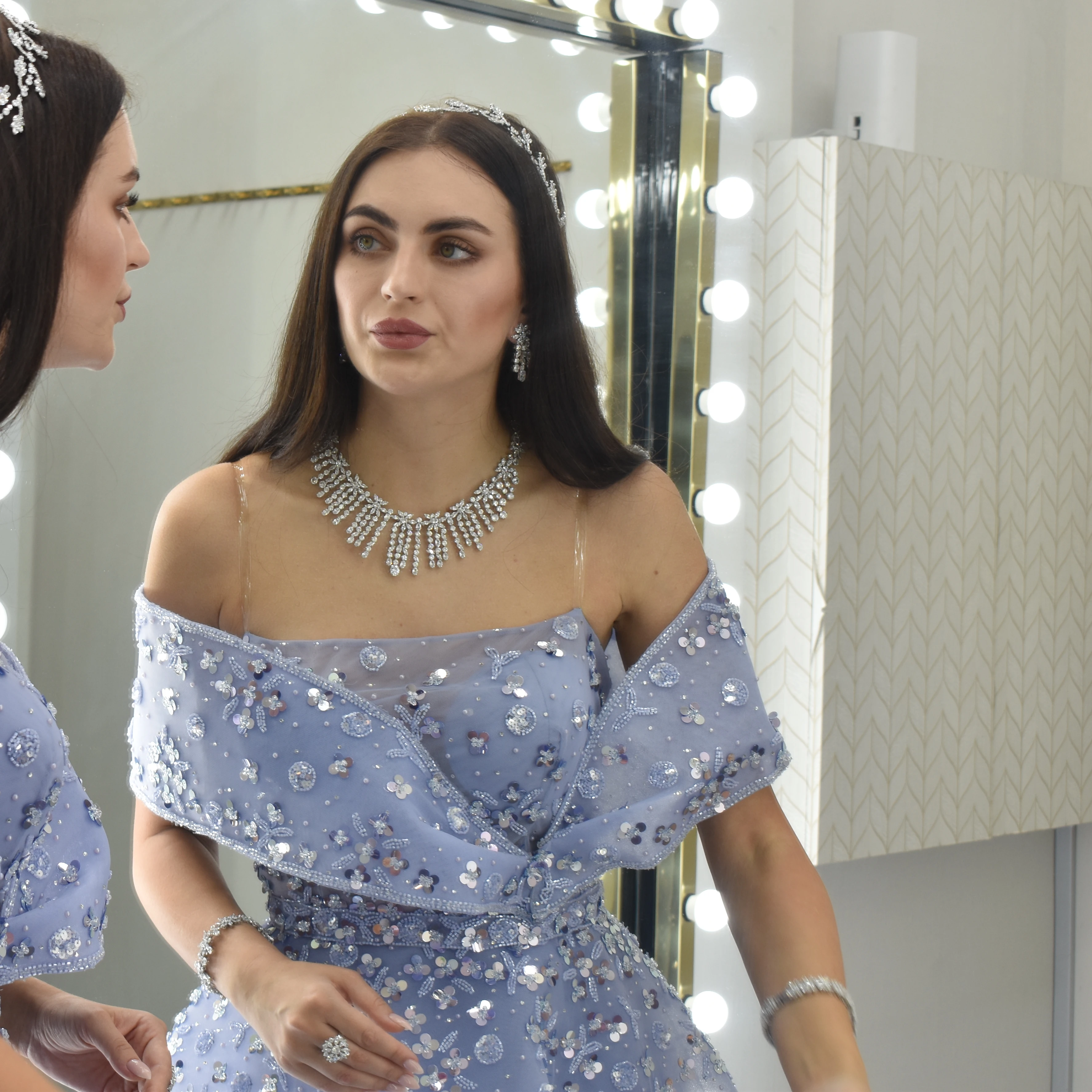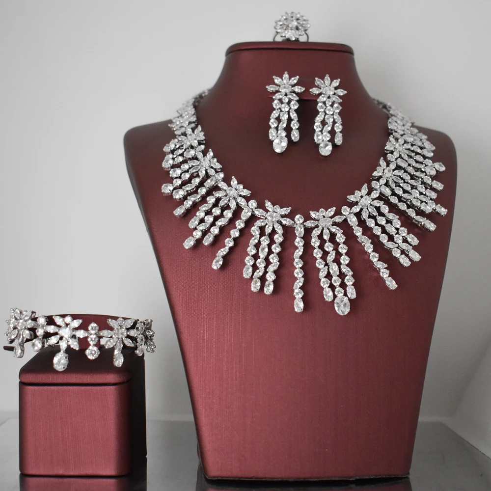 A set plated with white gold (rhodium) using original zircon stones, guaranteed to last 5 years