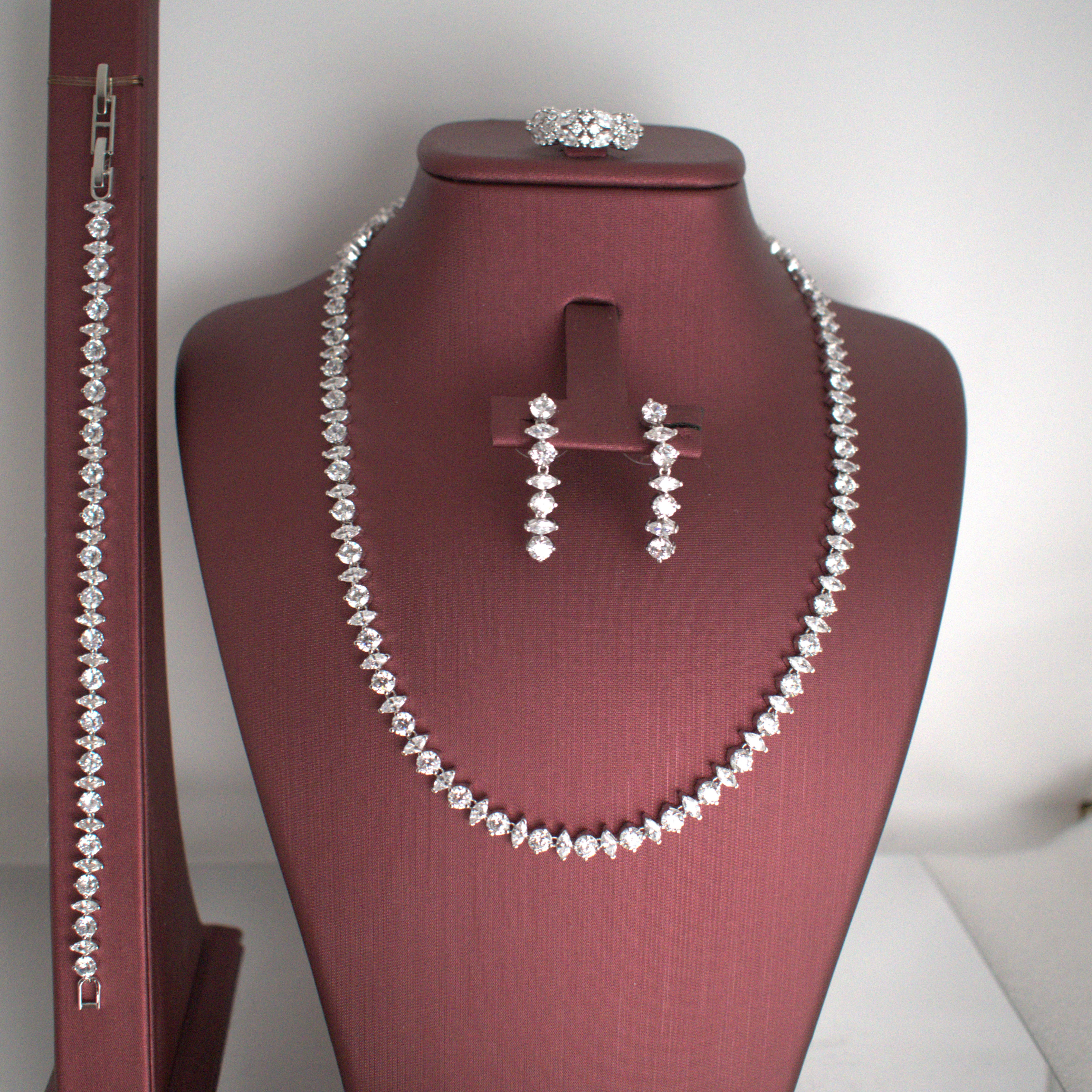 A set plated with white gold (rhodium) using original zircon stones, guaranteed to last 5 years
