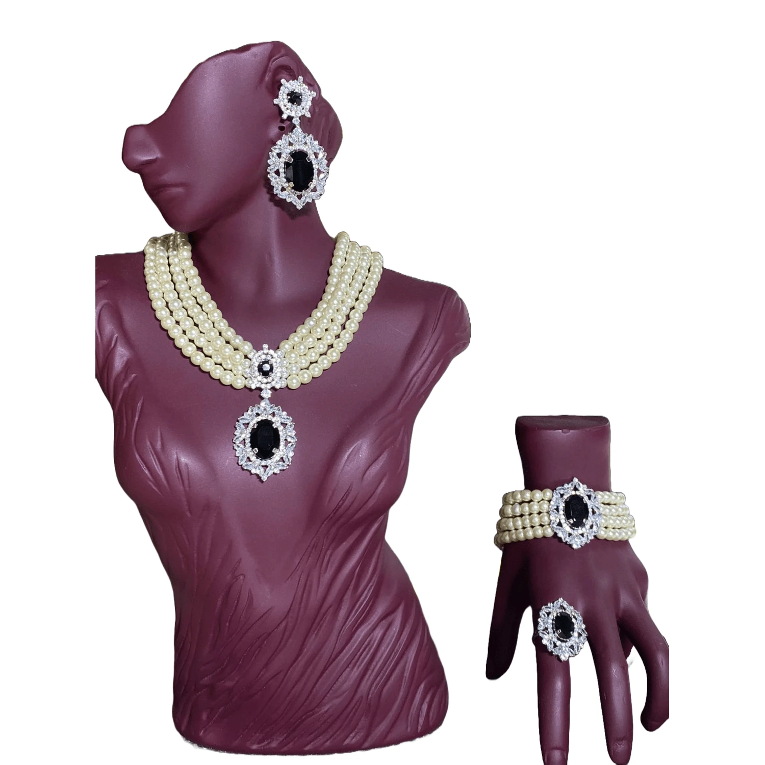 A set made with the finest types of luxurious artificial pearls and original colored zircon stones with a 5-year color guarantee